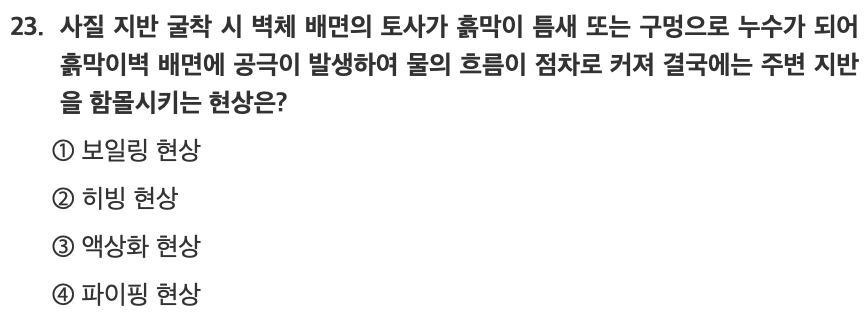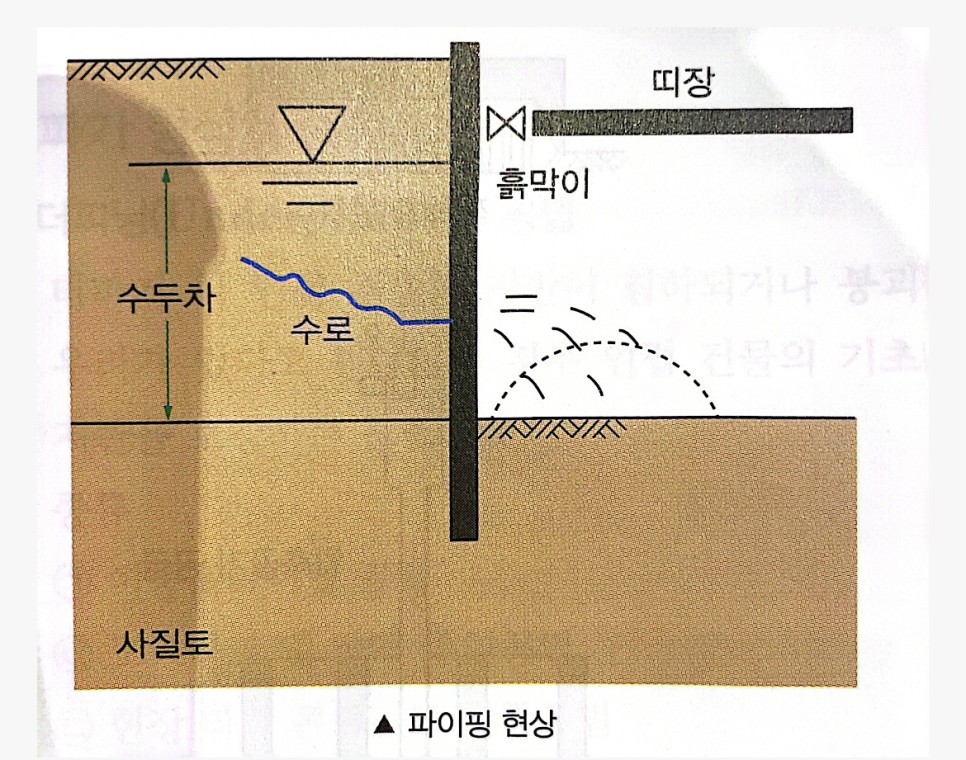 모래질 지반에서 흙막이벽 뒷면의 지하수가 흙막이벽의 밑을 돌아서 기초파기 공사장 안으로 모래와 같이 솟아오르는 현상이다.