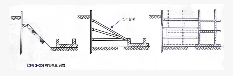 측벽이나 주열선 부분을 먼저 파내고 그 부분의 기초와 지하구조체를 축조한 다음 중앙부의 나머지 부분을 파내어 지하구조물을 완성하는 공법