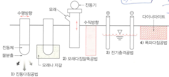 3) 전기충격공법 : 사질토에서 Water jet로 굴진하면서 물의 공급을 통하여 지반을 포화상태로 만들고 방전 전극을 삽입하여 고압방전을 일으키고 이로 인한 충격력으로 지반을 다지는 공법