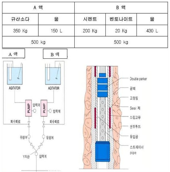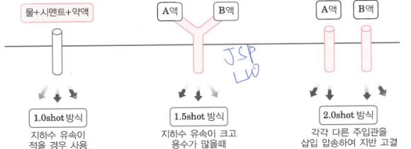 ② LW공법 (Labiles Waterglass method) : 규산소다 수용액과 시멘트 현탁액을 혼합하여 지상의 Y자관을 통하여 지반에 저압(10~20Kg/cm2)으로 주입시키는 공법