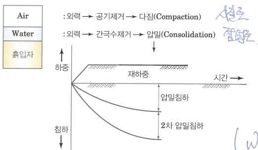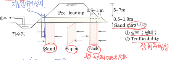 : 재하중에 의하여 생기는 압밀침하를 단기간 내 진행시키고 또한 압밀에따른 지반강도 증가를 기대하도록 연약점토층에 Sand pile을 형성 강제 압밀 배수시키는 공법