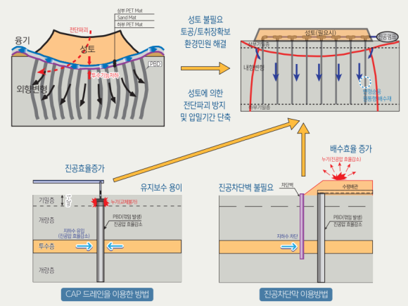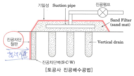 ① 토공사 진공배수공법 : 지반개량 부위에 Sand Filter(Sand Mat)를 시공하여 진공상태로 만들고 재하중으로서 성토 대신 대기압을 이용하여 탈수에 의해 연약토층의 압밀을 촉진시키는 공법