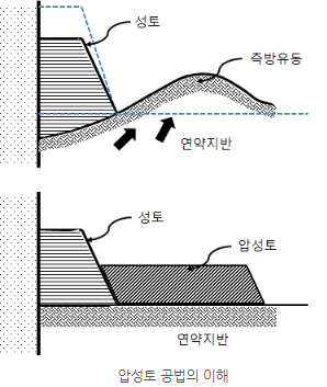 ① Preloading 공법 : 구조물을 축조할 곳에 흙을 성토하여 먼저 침하시켜 흙의 전단 강도를 증가시킨후 성토부분을 제거하는 공법