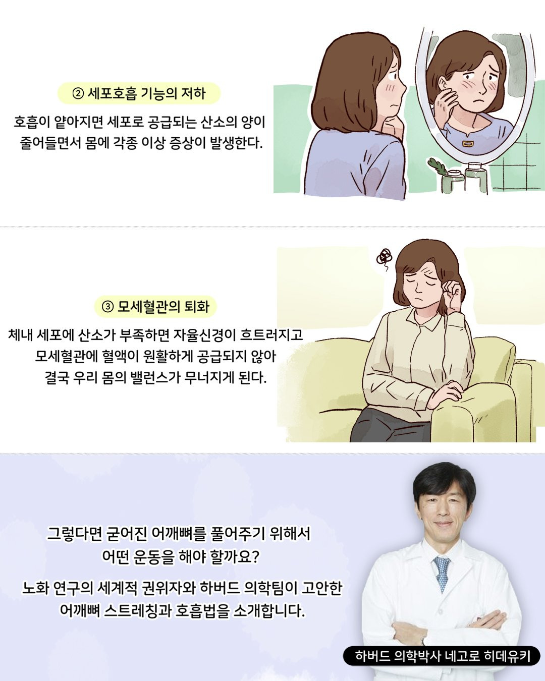 ‘인간은 세 번 늙는다’라는 말이 있다. 그러나 진짜 노화의 시작점은 어깨뼈가 굳는 그 순간이다. 이제 하루 3분이면 충분한 어깨뼈 운동과 호흡법을 한 동작씩 따라 해보자. 과정은 모두 하버드 의학팀이 고안한 것으로, 이를 매일 따라 하고 기적 같은 효과를 보았다는 실제 후기가 지금도 쏟아지고 있다.