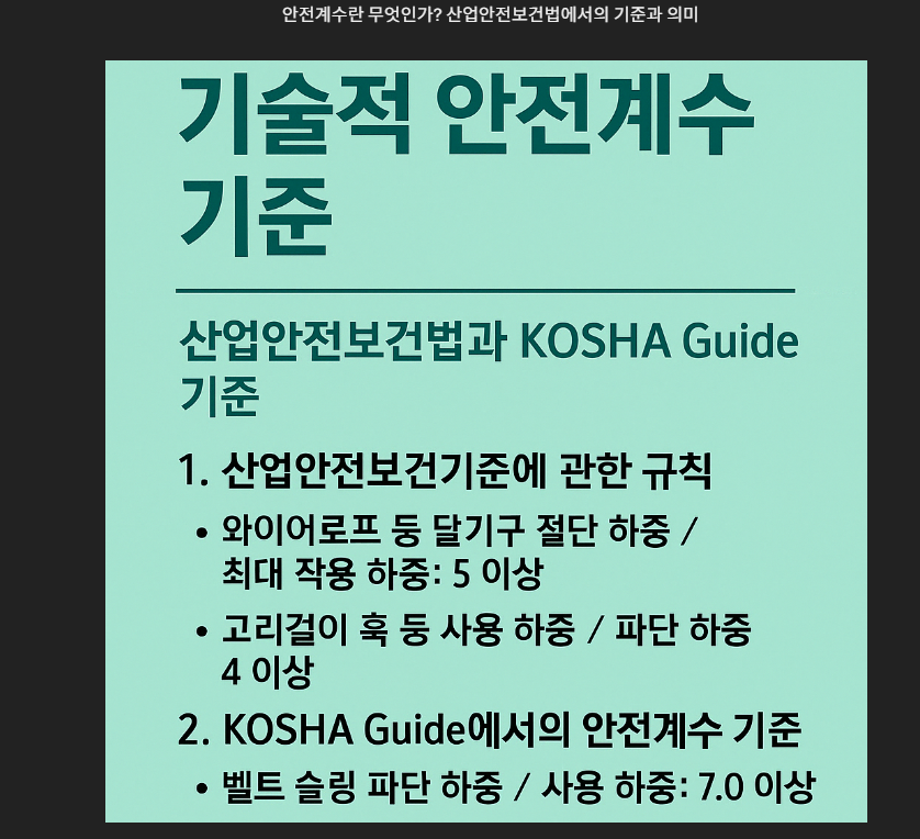 더보기1와이어 로프 안전률1. 와이어로프 안전율- 근로자가 탑승하는 운바구를 지지하는 달기와이어로프 또는 달기체인의 경우 10이상 -. 화물의 하중을 직접 지지하는 달기와이어로프 또는 달기체인의 경우 5이상 - . 훅, 샤클, 클램프, 리프팅 빔의 경우 : 3이상 -. 그 밖의 경우 : 4이상2안전계수의 정의2. 안전계수의 정의 일반적으로 어떠한 자재나 소재에서의 파괴하중과 허용하중의 비 또는 파괴강도와 허용응력의 비를 뜻하며 구조물과 기계안전을 위해 안전계수가 유지 되어야 합니다 정하중일 경우 3~4배, 동하중일 경우 5~10배로 합니다.3안전율 공식 - 안전율 = 파단하중 / 안전하중 - 안전율 = 항복응력 / 허용응력 - 안전율 = 파괴하중 / 사용하중 - 안전율 = 최대응력 / 허용응력* 와이어..